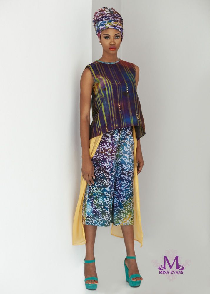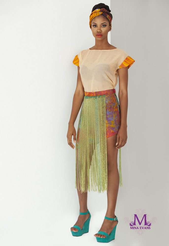 It features geometric silhouettes made from hand-dyed batik sun cloth. The collection also introduces a new design detail ombrè chiffon strips and signature Mina Evans fringe detailing and subtle beading.