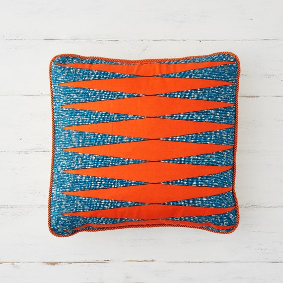 This cushion is made with vibrant African wax print cotton on the front, extra thick unbleached cotton twill on the back to create a sturdy and durable cushion, and silky piping to bring out the beautiful colours in the print to create a bold statement cushion.